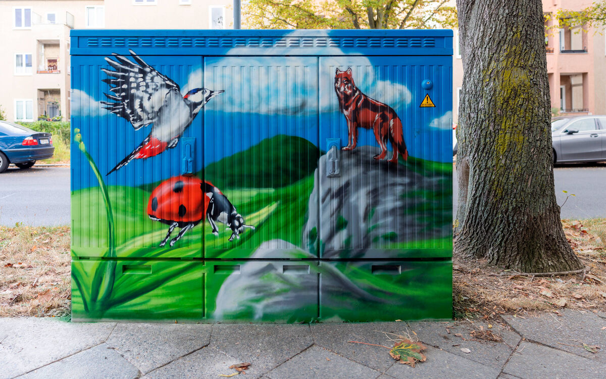 De Anwohnenden konnten mithilfe von Fotos und Klebepunkten den Telekom-Kasten auswählen, den Jugendliche aus Borsigwalde unter Anleitung des meredo künstlerisch gestalten werden.