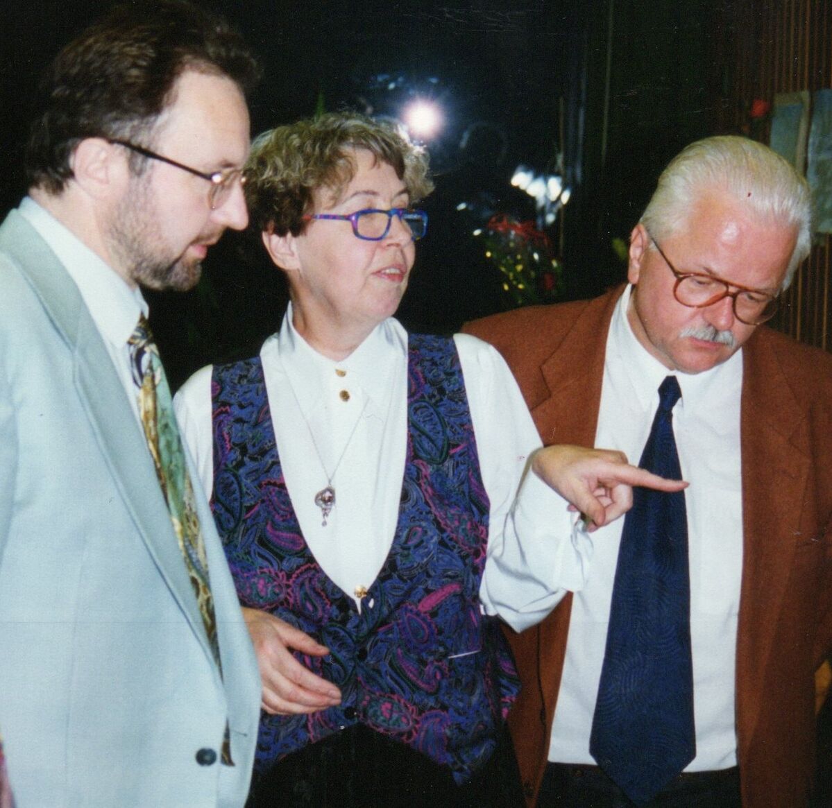 Franziska an ihrem 60. Geburtstag am 24. Oktober 1994 mit den beiden Gratulanten Thomas Gaudszun und Wolfgang Voß (von links).